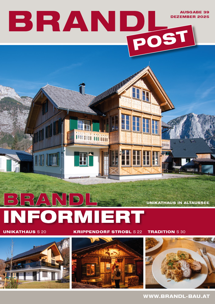 Neben den, bereits zum Standard unserer BRANDL-Post gewordenen, Berichten über unsere Unikathäuser, gibt es in dieser Ausgabe auch wieder einige Besonderheiten zu sehen und zu lesen. Von der Runderneuerung der Straßenmeisterei Bad Ischl bis zum Musikpavillon, der anlässlich der Bad Ischler Landesgartenschau errichtet wurde, spannt sich wieder ein großer Themenbogen, der einen kleinen Einblick in die unterschiedlichsten Projekte geben sollte. Über den abgehaltenen Sicherheitstag informieren wir genau so, wie über die durchwegs erfreulichen Neuigkeiten aus dem Personalbereich.